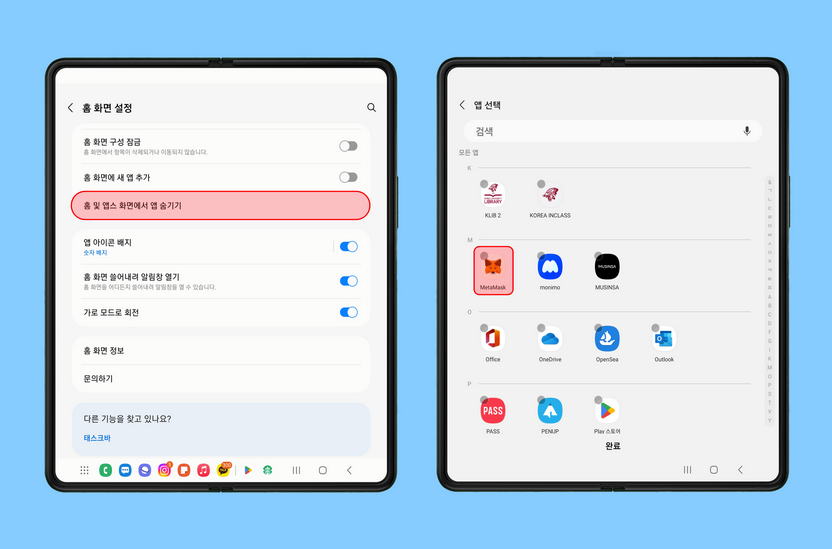 갤럭시 앱 숨기기는 앱을 삭제하지 않고 홈 화면과 앱스 화면 모두에서 아이콘만 보이지 않게 처리하는 기능입니다.