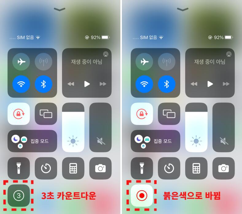 이 카운트다운 중에는 제어 센터를 닫고 다른 앱을 실행해도 녹화가 취소되지 않기 때문에, 이 시간 동안 화면을 정돈할 수 있습니다.