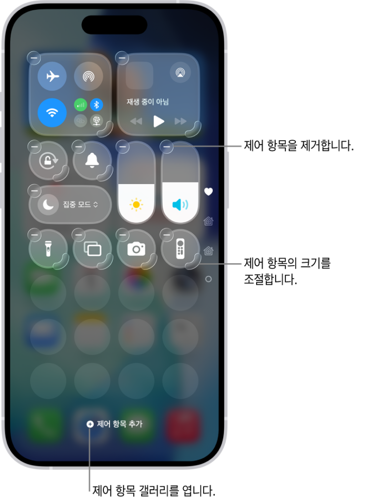 이제는 설정 앱을 뒤질 필요 없이, 화면 오른쪽 상단을 내려 제어 센터를 연 상태에서 바로 편집이 가능합니다.